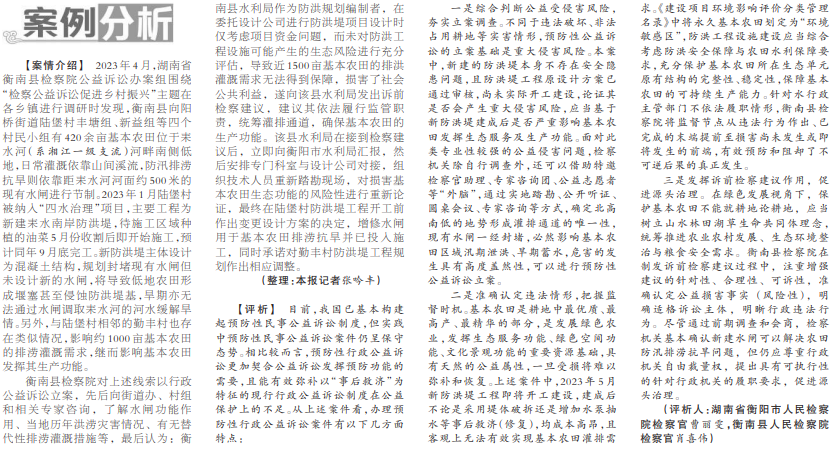 二是准确认定违法情形,把握监督时机。基本农田是耕地中最优质、最高产、最精华的部分,是发展绿色农业,发挥生态服务功能、绿色空间功能、文化景观功能的重要资源基础,具有天然的公益属性,一旦受损将难以弥补和恢复。上述案件中,2023年5月新防洪堤工程即将开工建设,建成后不论是采用堤体破拆还是增加水泵抽水等事后救济(修复),均成本高昂,且客观上无法有效实现基本农田灌排需求。《建设项目环境影响评价分类管理名录》中将永久基本农田划定为“环境敏感区”,防洪工程设施建设应当综合考虑防洪安全保障与农田水利保障要求,充分保护基本农田所在生态单元原有结构的完整性、稳定性,保障基本农田的可持续生产能力。针对水行政主管部门不依法履职情形,衡南县检察院将监督节点从违法行为作出、已完成的末端提前至损害尚未发生或即将发生的前端,有效预防和阻却了不可逆后果的真正发生。