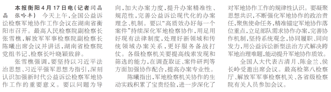 本报衡阳4月17日电(记者闫晶晶 张吟丰)今天上午,全国公益诉讼检察军地协作工作会议在湖南省衡阳市召开。最高人民检察院副检察长张雪樵,解放军军事检察院副检察长陈曦出席会议并讲话,湖南省检察院党组书记、检察长叶晓颖致辞。